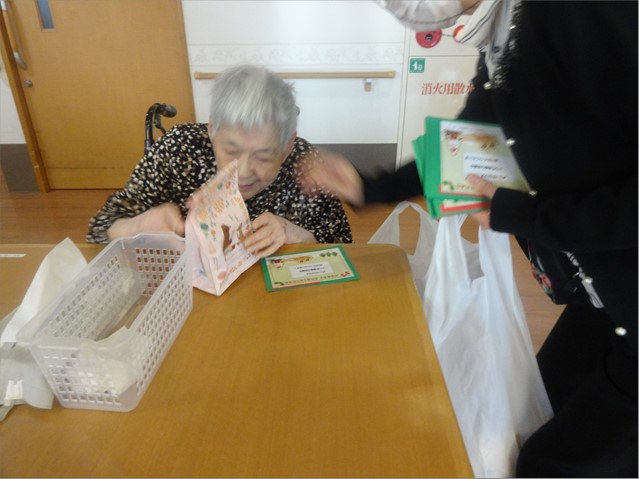 入居者の皆さんは「なんだろうねえ」プレゼントの中身に興味しんしんです。