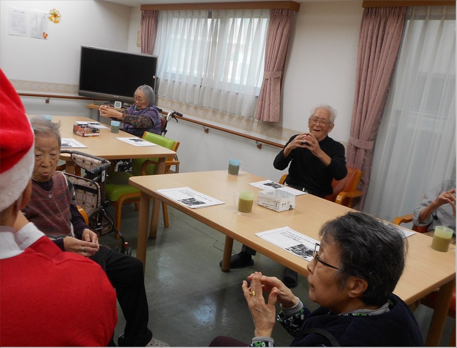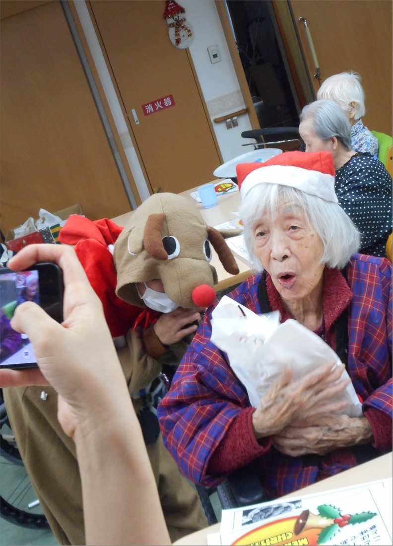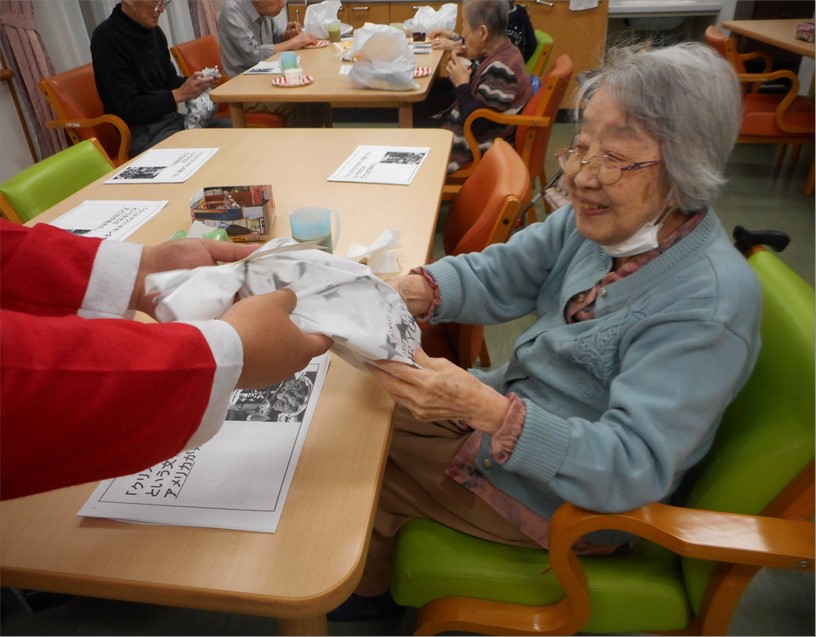 「これ頂いていいんですか?嬉しいわあ」「貴方のひざかけいい色だね」「貴方の靴下もあったかそうじゃない」笑顔がこぼれんばかりにいっぱい見られました!喜んでいただけて…サンタクロースと仲間達も嬉しいです。