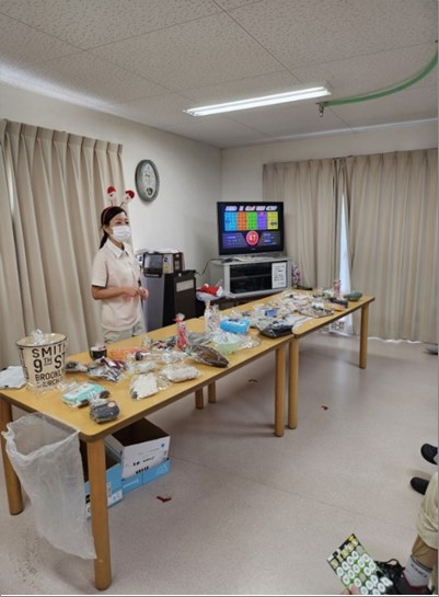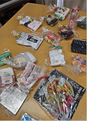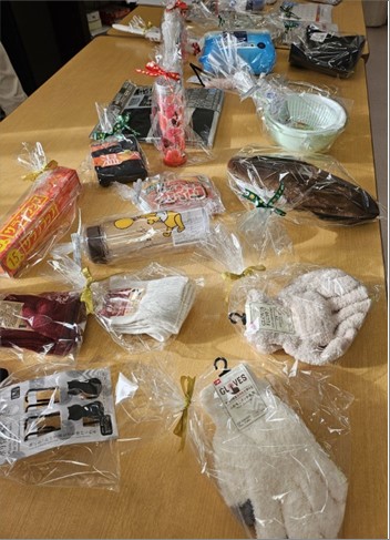 「ビンゴゲーム」の景品は何かな?。ヘアブラシや靴下、手袋など普段から良く使う物がテーブルに並びます。
