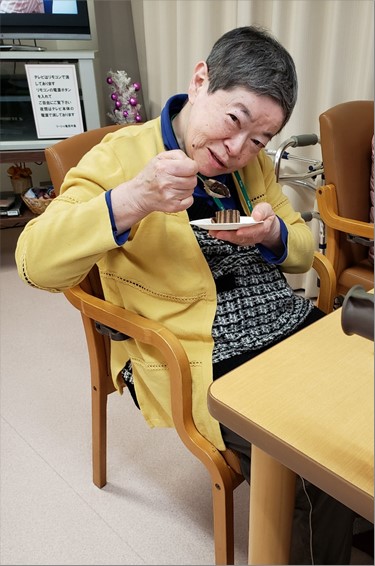 夕食にはチョコレートかイチゴのロールケーキを入居者の皆様全員へお配りました。