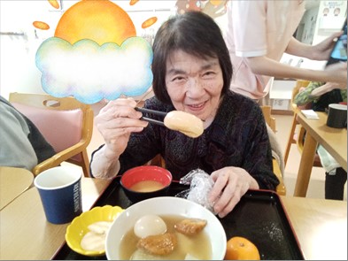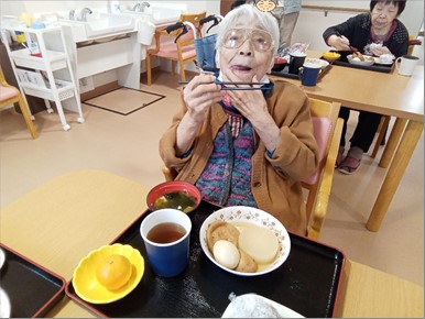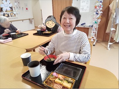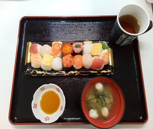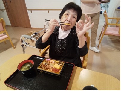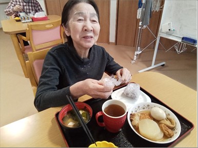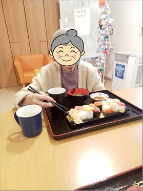 可愛らしいお寿司、エビやカキなどいつもとは違った食事に「豪華で美味しいわ!」「お祝い事があったみたいね」と笑顔で召し上がっておりました(*^_^*)