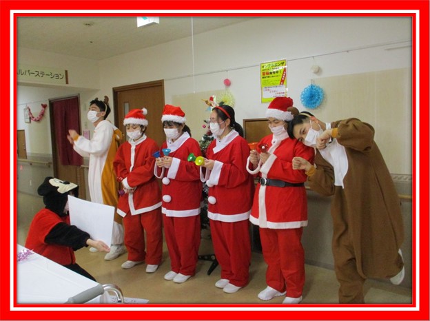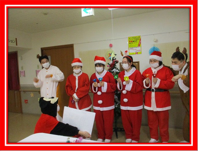 サンタクロースに扮した実習生が各フロアを回り、ハンドベルの演奏を披露、クリスマスの雰囲気を盛り上げてくれました!