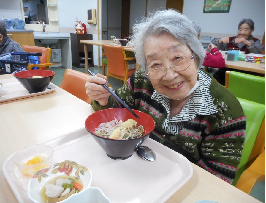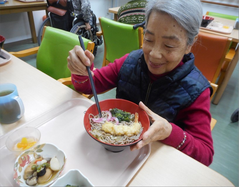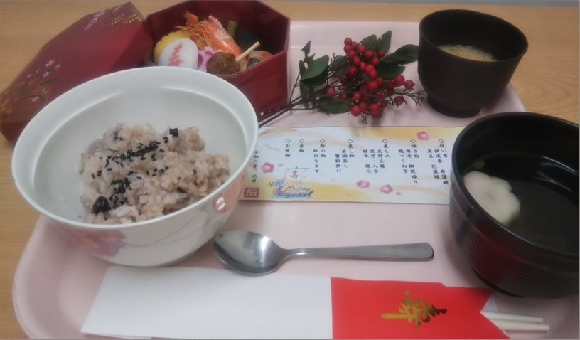 季節感を大切にして、栄養士が献立を考えているのですが、年末年始は定番ではありますが『年越しそば』そして、『お雑煮』、『おせち料理(お赤飯)』です。