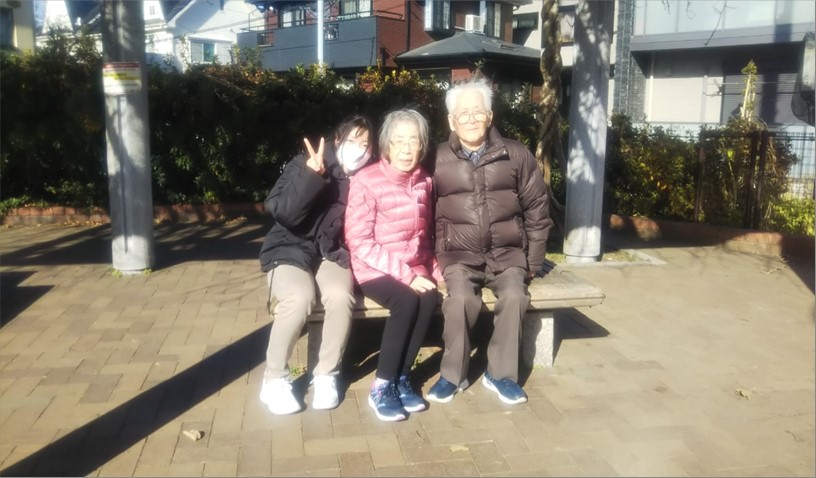 お日様の照らす中、歩いて行けば「空気冷たいけどキリリと気持ちいいね!」と笑顔♪ベンチで休憩しつつひなたぼっこです。