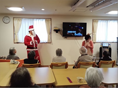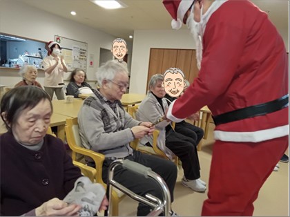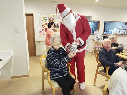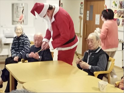 入居者様のなかには「優しくして貰ってるの。お世話になってるよ」とサンタクロースの正体が分かっている方もサンタさんからひとり、ひとりにプレゼントが手渡されました。