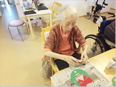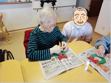 クリスマスの壁面飾りを作成しました。出来上がったリースは皆さんの居室入口に飾りました。