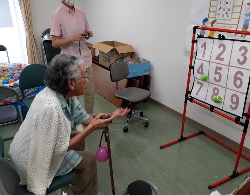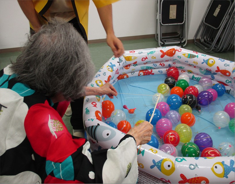 水風船を釣ったり、ボール的あてでお菓子の景品を当てると、「懐かしい」「楽しかったわ」と皆様笑顔で喜ばれました。