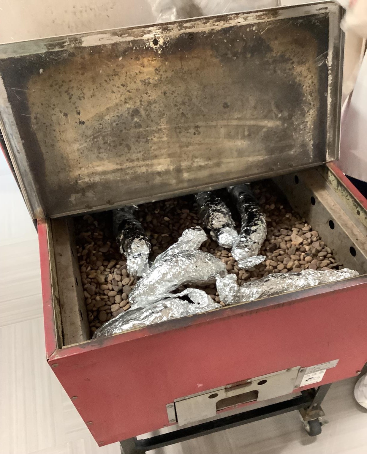 お芋にはひとつづずアルミホイルを巻いて、焼き機に入れます。30分後にひっくり返し、さらに20分焼きます。