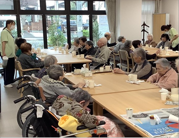 焼き終わりの頃ご入居者様全員を1階ホールへ誘導しつつ焼き機もホールへ移動。あたり一面、お芋の焼けた甘い香りがただよいます。