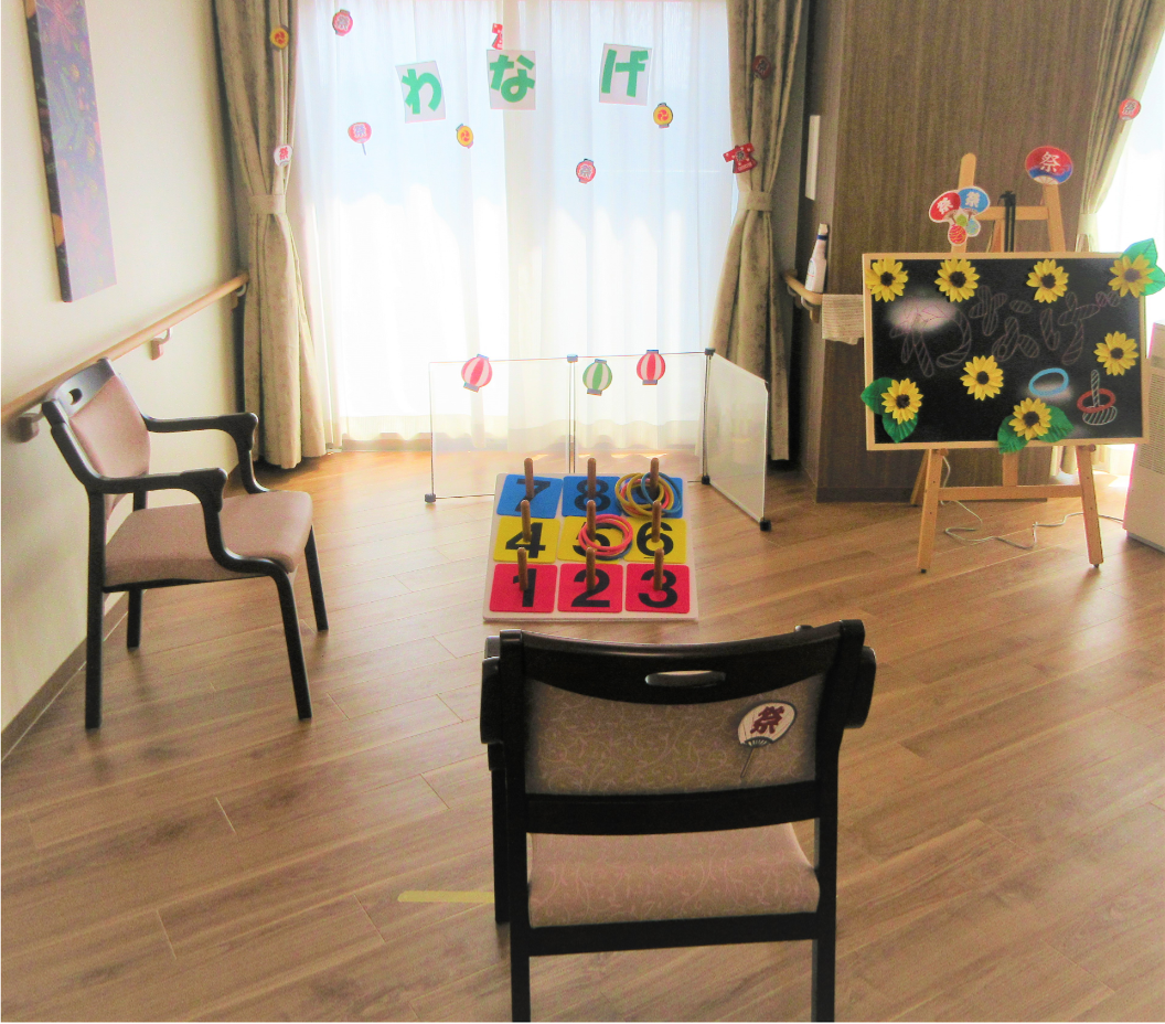 輪投げや、射的、ヨーヨー釣り等の縁日コーナーを体験していただいたり、映像での花火鑑賞や、焼きそば、フランクフルト等のお祭りメニューを召し上がって頂きました。
