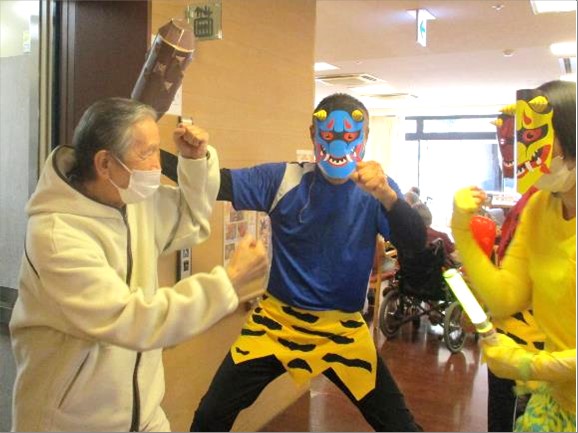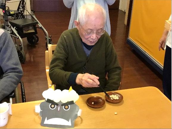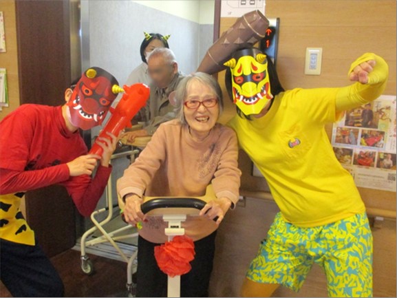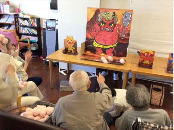 本日は節分の日!毎年恒例の≪鬼退治ゲーム≫と≪豆つかみ競争≫を行いました。