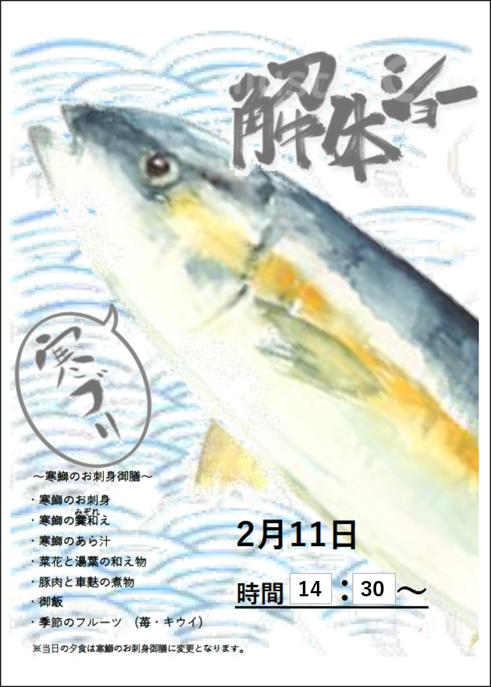 今月はなんと「寒鰤解体ショー!!」を予定しております。