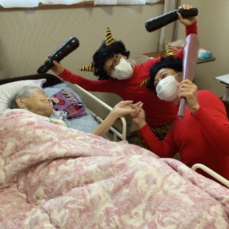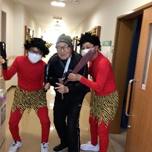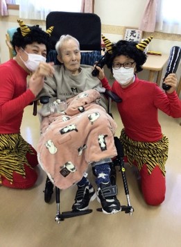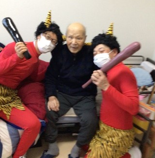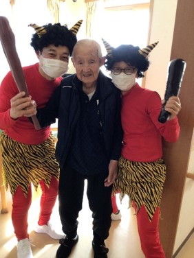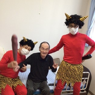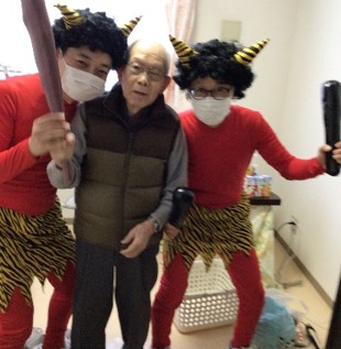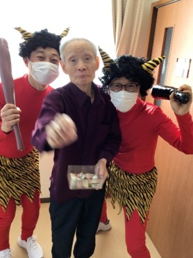 豆まきを終えた後は、入居者様と赤鬼が肩を組み笑顔で記念撮影をし、お互いの健闘を称えました。