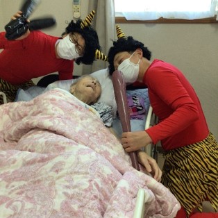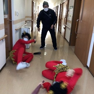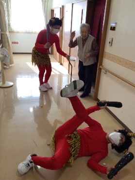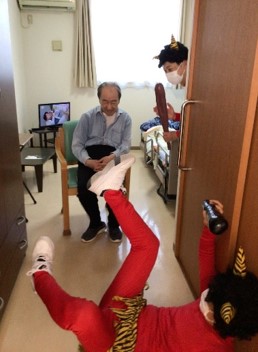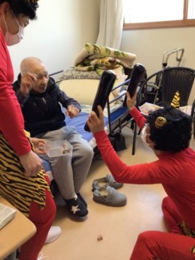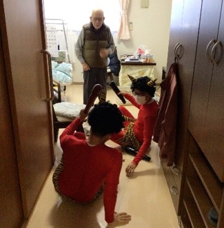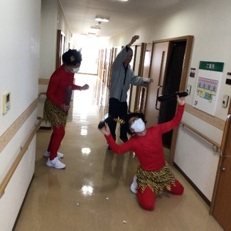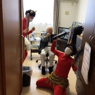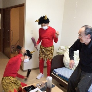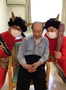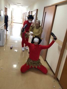 『鬼は外 ! 鬼は外 !!』赤鬼はご入居様に豆を投げられて、リビング・居室・廊下などを逃げ回り撤退しました。