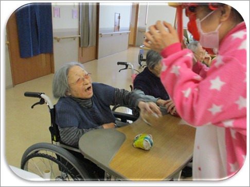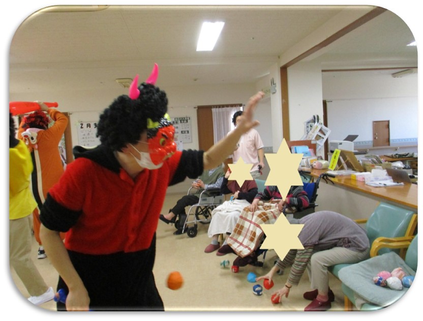 激しく鬼との大合戦!入居者様も負けてはいません、鬼にめがけて『エイ、ヤー!!』と力一杯頑張りました☺