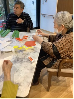 製作レクは入居者様が同じテーブルを囲み、手先を使って紙を切ったり細かい作業を行う事で他者とのかかわりや手や指の機能向上を目指しています。