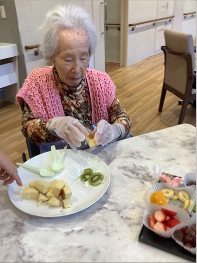 カップに思い思いのケーキやフルーツを詰めていきます。 みなさんとても真剣です。