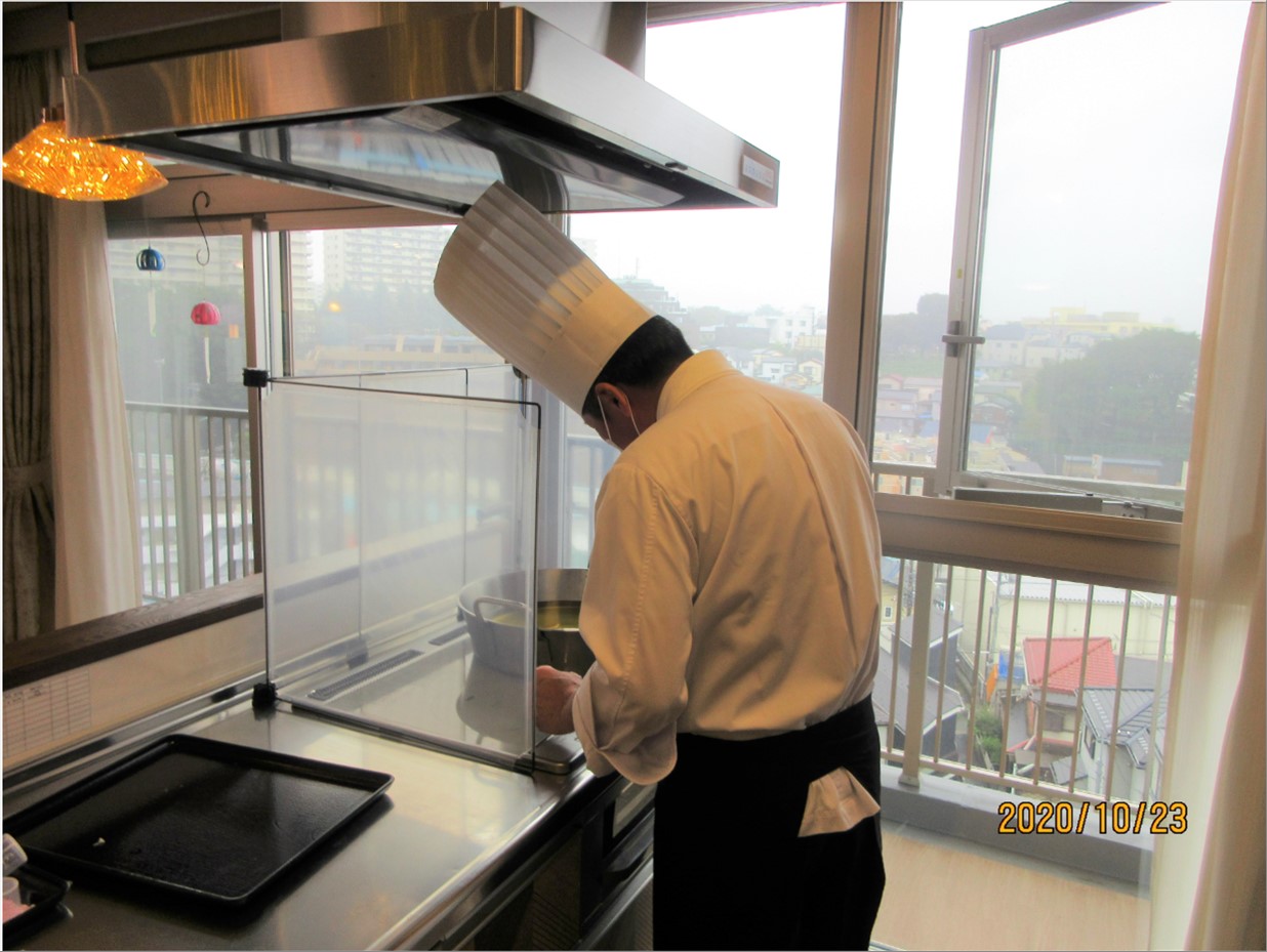 シェフが目の前で海老や鱚(きす)の天ぷらを揚げ、その揚げたての天ぷらを皆様に食べて頂きました。