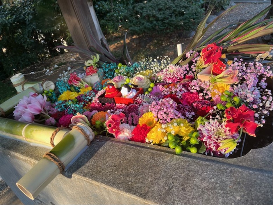 1回目では気がつかなかったのですが、手水舎にはたくさんの花で飾られていて、今で言う『映え』写真が取れました!
