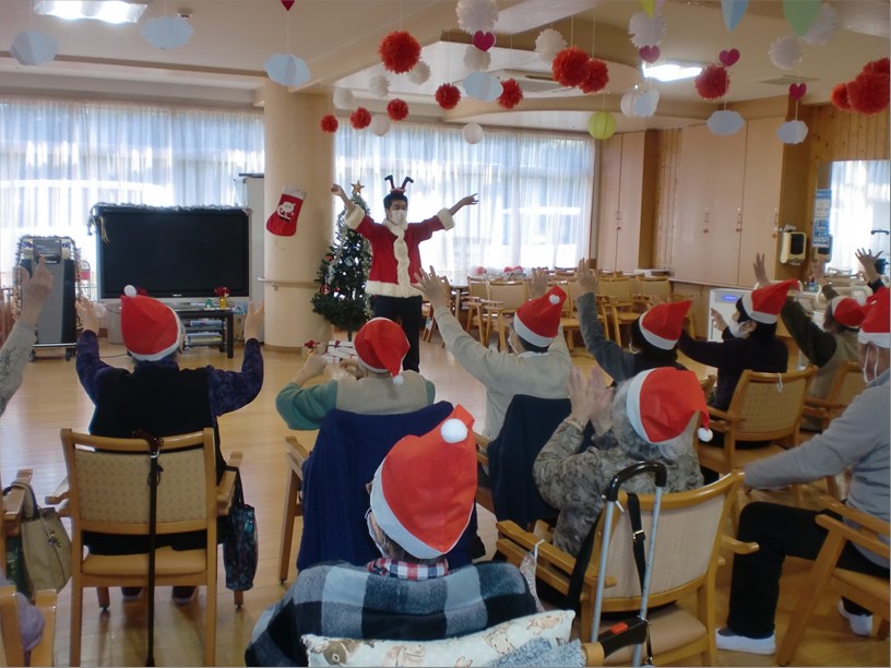 今回は、「①マッキー&クミッキーによるマジックショー」、「②機能訓練指導員による2020年Xmas版体操」、「③職員によるジングルベルダンス」、「④豪華景品が当たるビンゴ大会」を行いました!