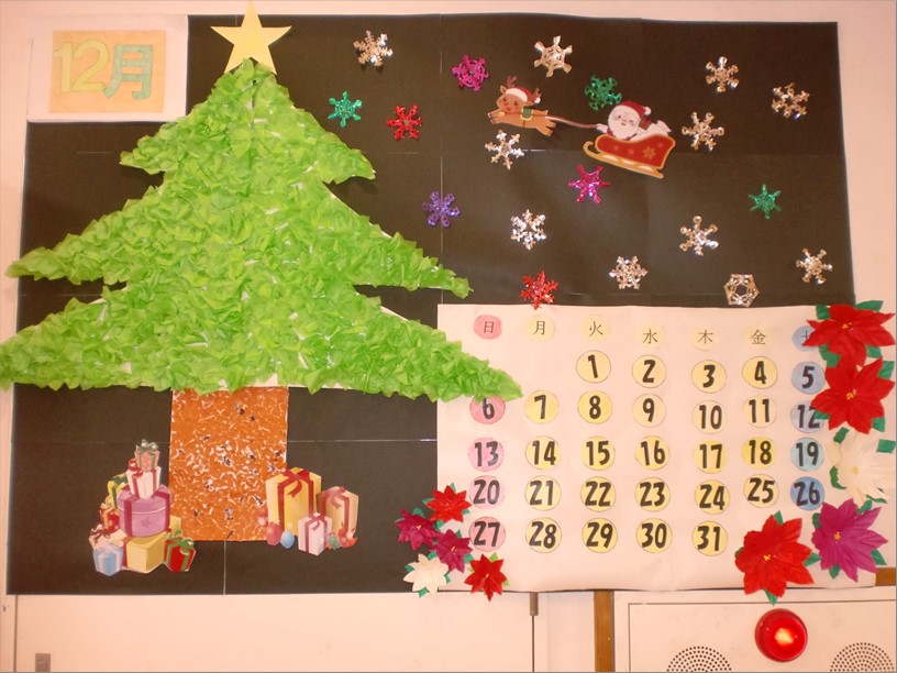 ご利用者様と一緒にちぎり絵にてXmasツリー作成や毎月恒例の手作り大カレンダーもみんなで協力し完成させました。