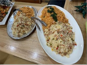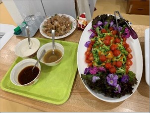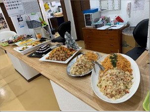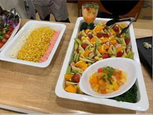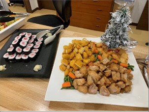 昼食バイキングでは、ピラフやナポリタン、唐揚げ、お寿司などがあり、特にまぐろの太巻き(輪切り)とスープが大好評でした。