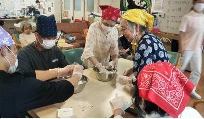 午後にはテラスに出てご利用者様と一緒に野菜作りのお手伝い、クッキングレクでは冷たい白玉を作っていただきました。