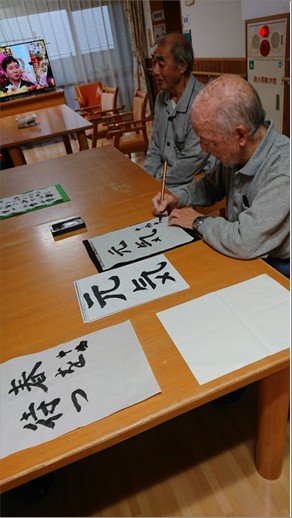「筆を持つと気が引締まる感じがして、清々しいです」、「なんて書こうかな」と和気あいあいな様子。