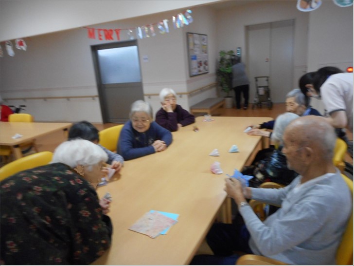 折り紙好きのご入居者様がフロアで折り紙を折っていると、1人、2人と人が集まり、、、、
