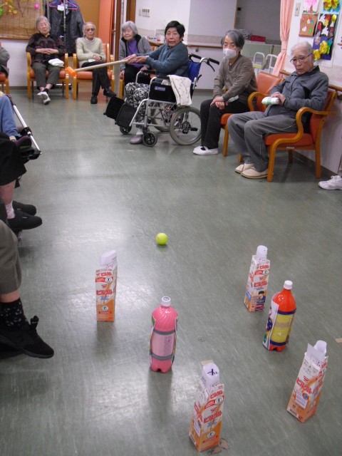 「ゲートボール大会」では、障害物のピンが倒れたら「立ち上がり10回」や「階段昇降」などのお題にチャレンジ!