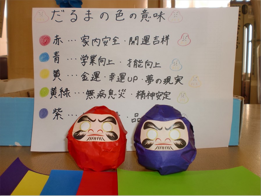 ダルマは色によってご利益が違うとのことで、赤・青・黄色・黄緑・紫の5色から好きな色と選んでいただき作成しました。