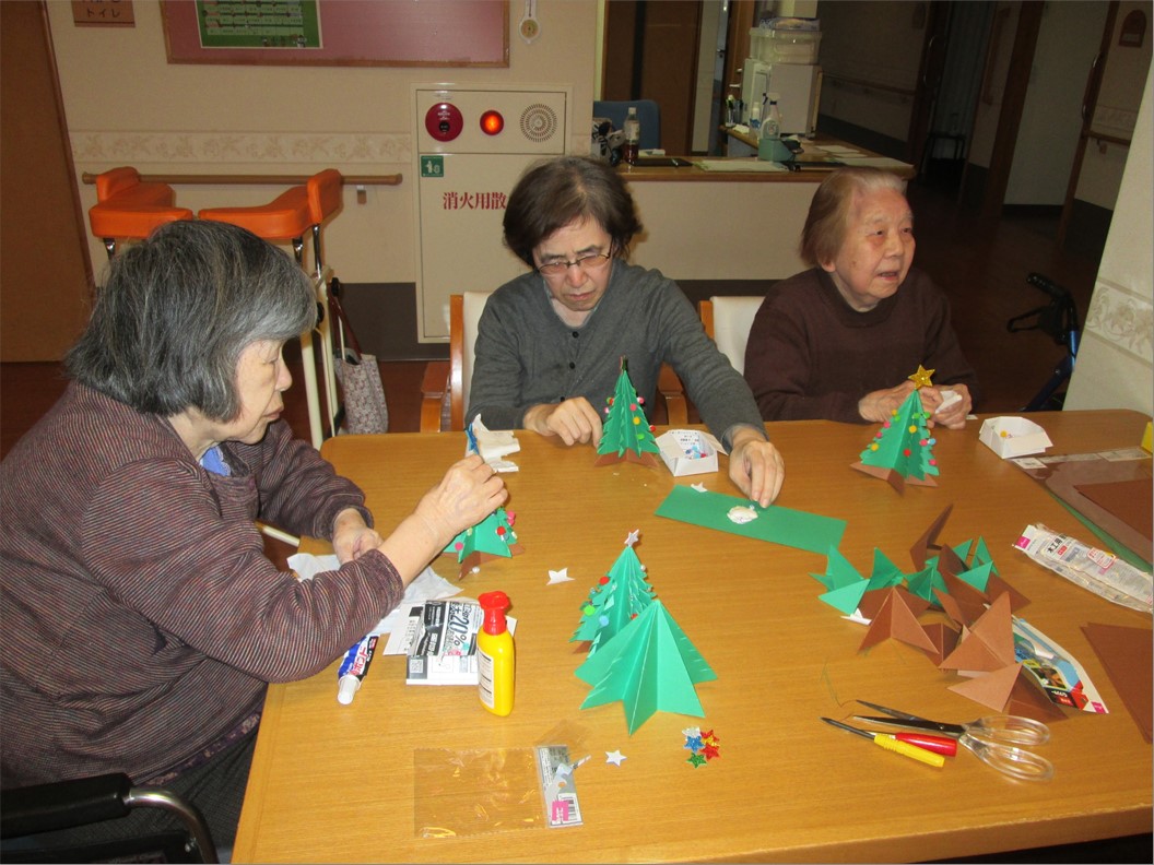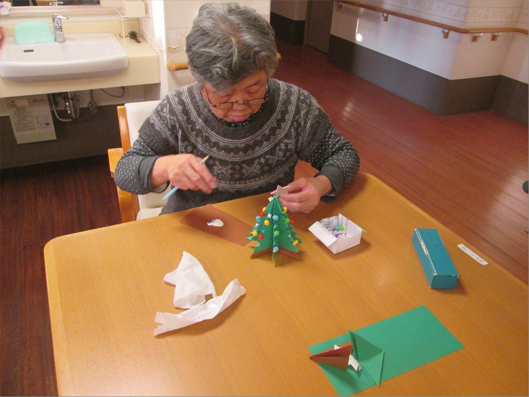 ご入居者様15名が参加して厚紙を折って仕上げるところからやっていただきました。