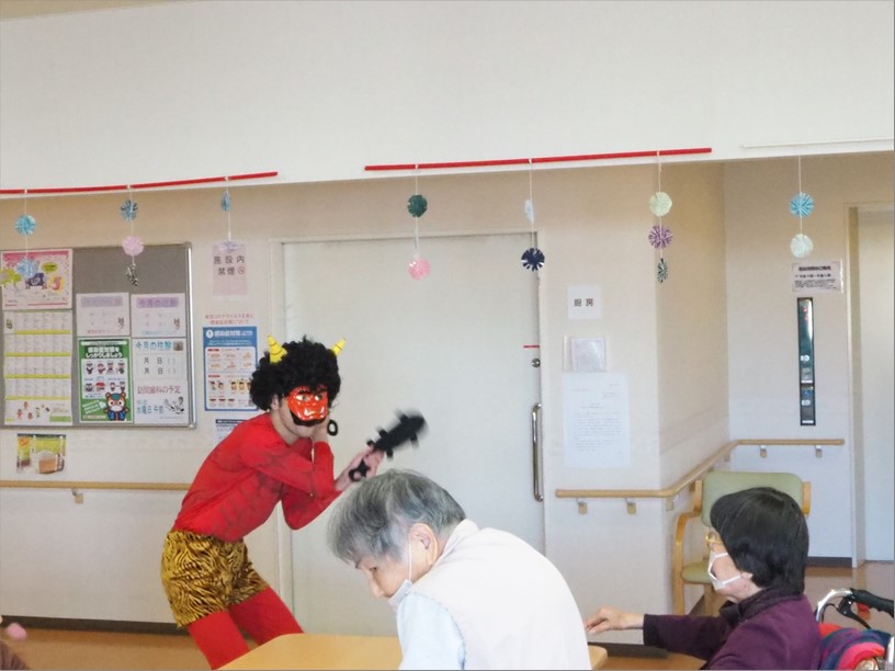 124年ぶりの2日(節分)の豆まきでしたが、入居者様もコロナ禍で外出自粛の日頃の鬱憤を晴らすかのように大きな声で「鬼は外!」「福は内!」と元気いっぱいに鬼退治。