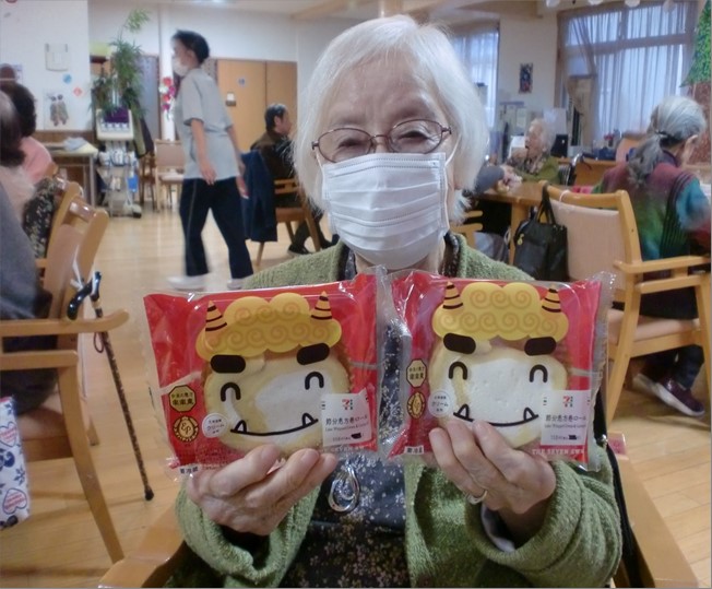 今回『デイサービスセンター ル・レーヴ南浦和』では豆まきレクリエーションと恵方巻ロールのおやつをご利用者様と楽しみました。