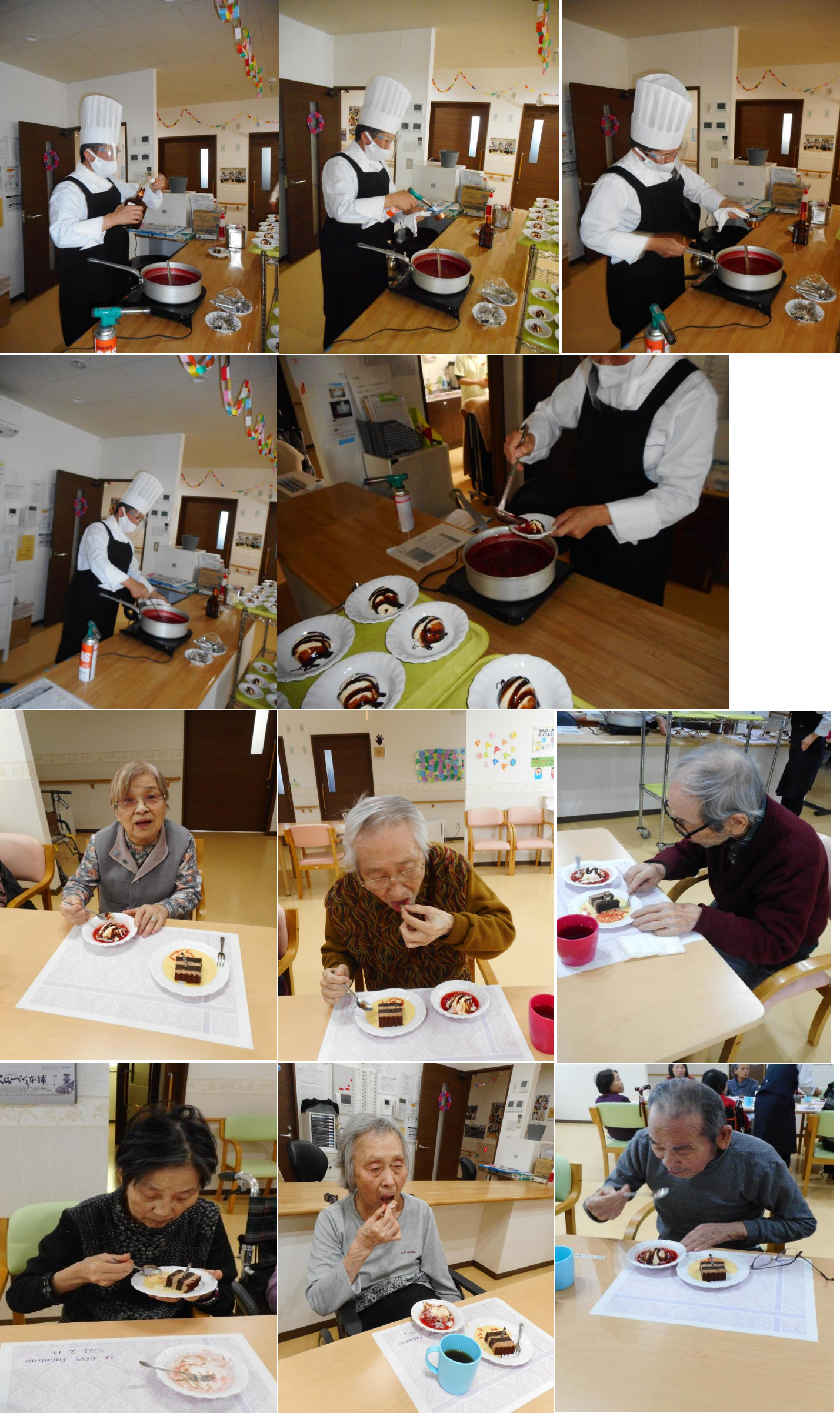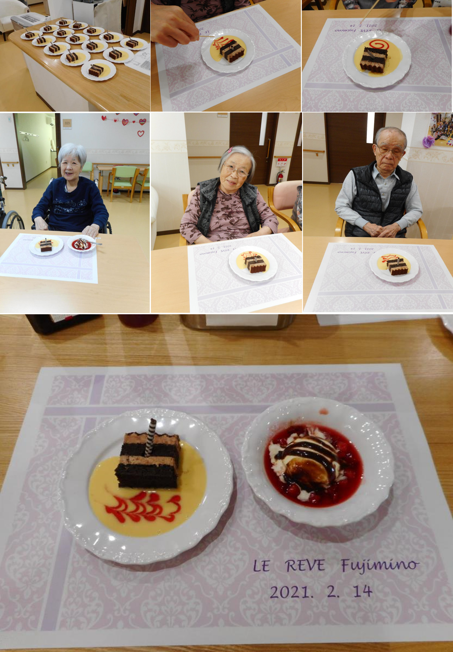 チョコレートケーキではシェフや職員が2種のソースでお皿に模様を描き目で楽しんで頂きました。