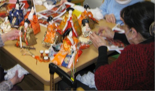 入居者様に雛壇の飾りつけやお顔拭きなど手伝ってもらい「これは三人官女の持ち物かしら」「ちょっと違うね~」と写真を見ながら飾りつけ!(^^)!