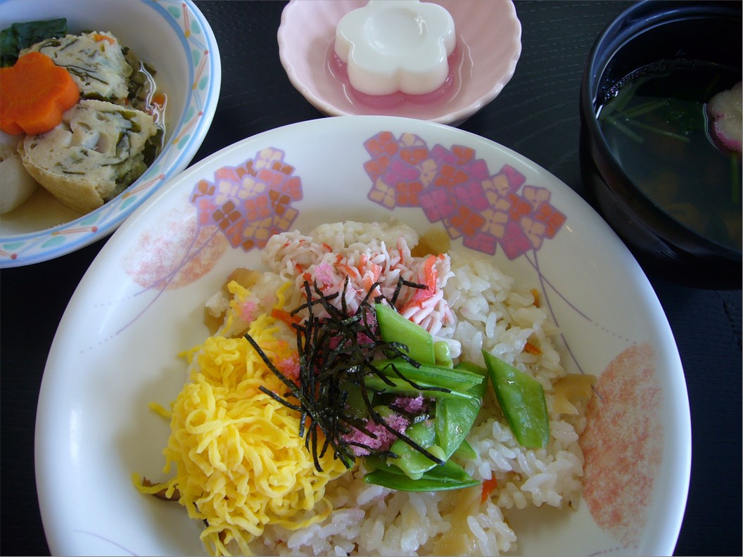 こちらは、その日の昼食「ひなまつり膳」です。散らし寿司・潮汁・ひなまつりゼリーなどです。