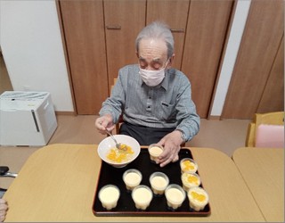 プリン作りを行いました!皆様、思い思いにフルーツとホイップクリームをトッピング♪「甘くて美味しい~」と好評でした。