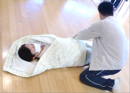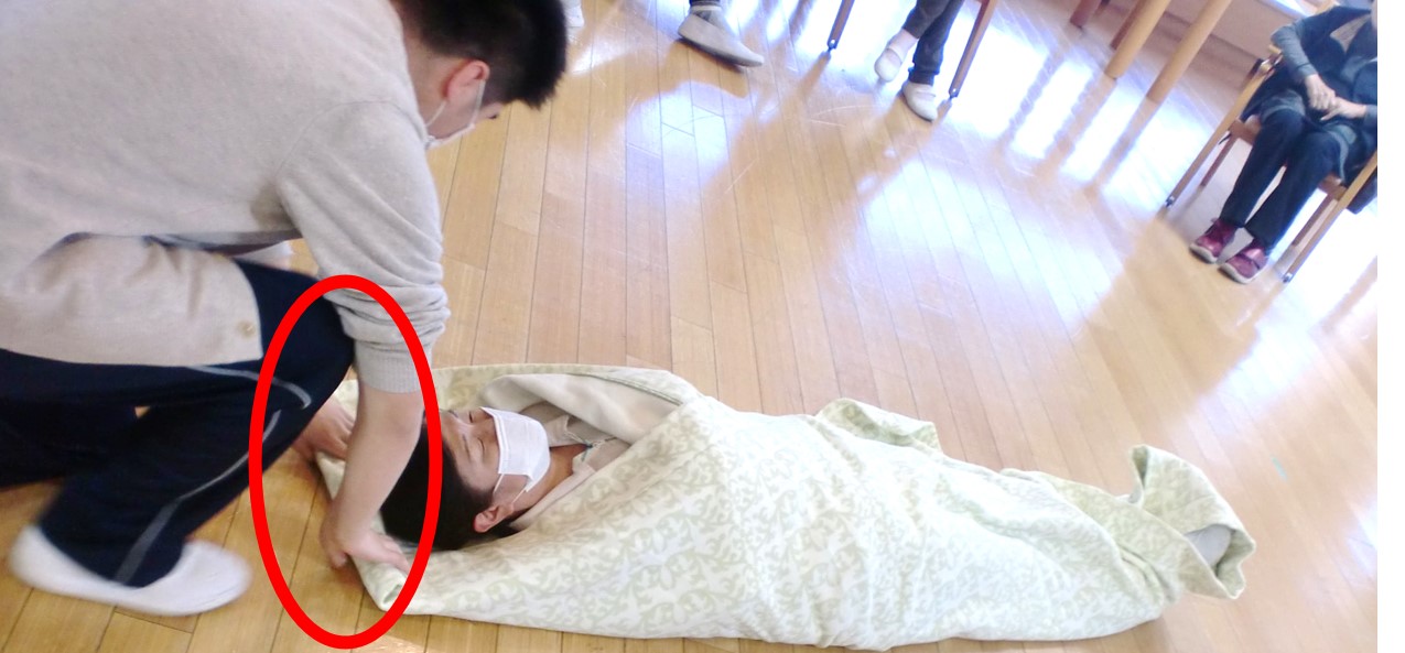 2.毛布、シーツを利用し移動する方法…意識障害の有無に関わらず、歩行不能な傷病者を毛布等で包み布ごと引っ張って移動する搬送方法。