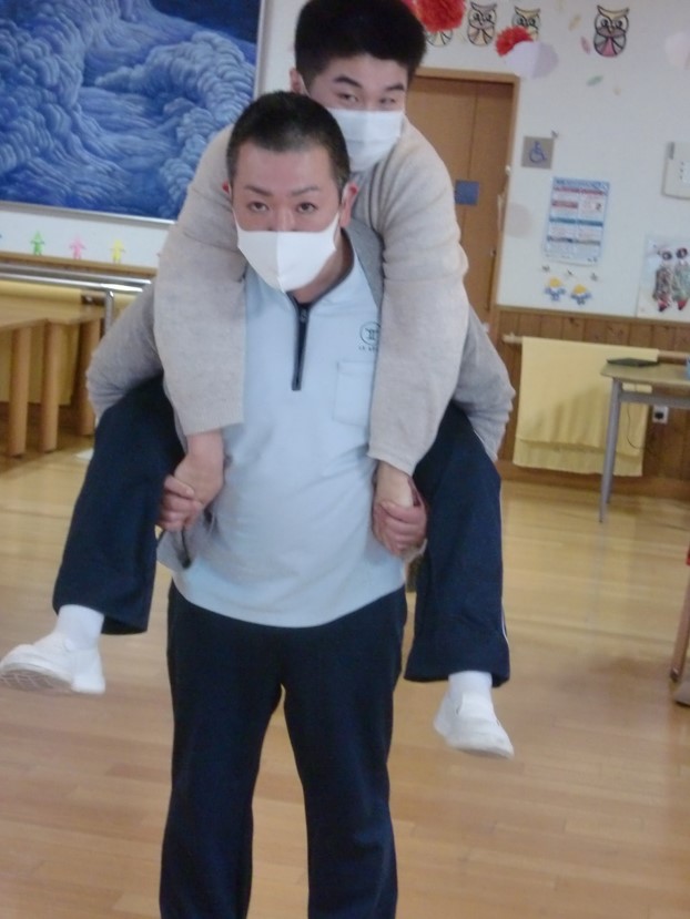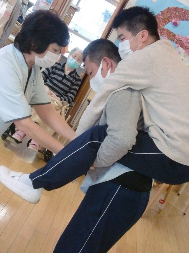 おんぶします。膝したから腕をいれ、前にきている手首を掴んで、体を密着させると安全な体制になり、安心して避難場所にお連れ出来ます。