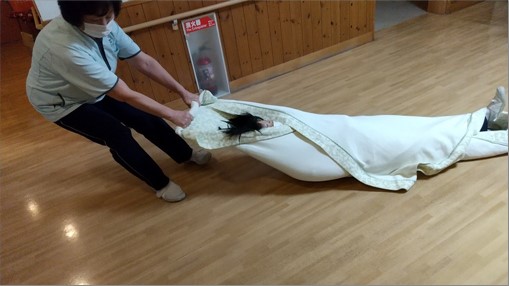 搬送する器具がなくても、身近にある毛布などを使います。毛布でくるむと体制も固定できて、保温にもなります。
