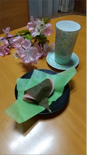 クイズが終わったら、ひな祭りにちなんだおやつ、桜餅(皮が薄くてほぼあんこ)と甘酒を楽しんで頂きました。