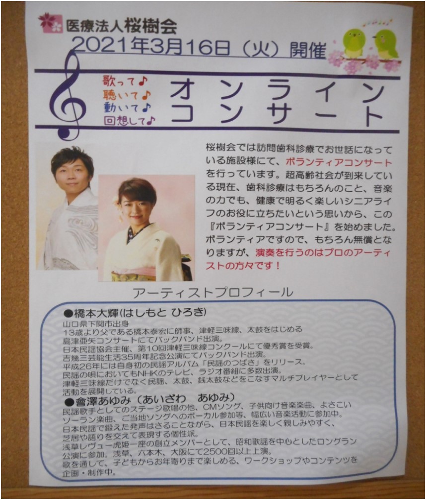 今回の『オンラインコンサート』はいつも訪問歯科でお世話になっている桜樹会様が音楽の力でも健康で明るく楽しいシニアライフの役に立ちたいという思いから、無償でプロのアーティストの方々が演奏を行って下さる『ボランティアコンサート』を始めたとの事で、『ル・レーヴ狭山さくら館』のテレビに来てくださいました。