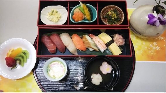 さて、『リーシェガーデン和光南館』では月に1度イベント食をお楽しみいただいておりますが、今月はかねてよりご入居者様から強いご要望のあったお寿司を企画させて頂き、3月20日(土)、春分の日のお昼に「春爛漫お寿司ランチ」をご用意いたしました。