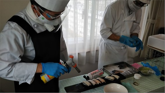 鮪、海老、サーモン等に加えて、シェフ自らご入居者様の目の前で鰆のにぎりを炙って頂きました。