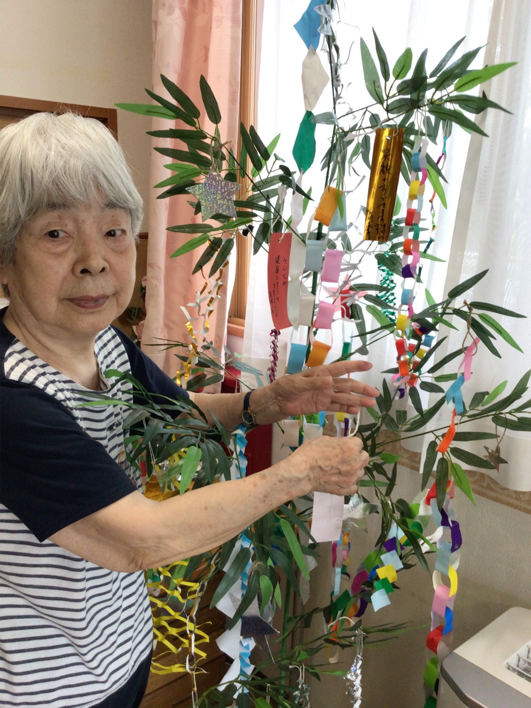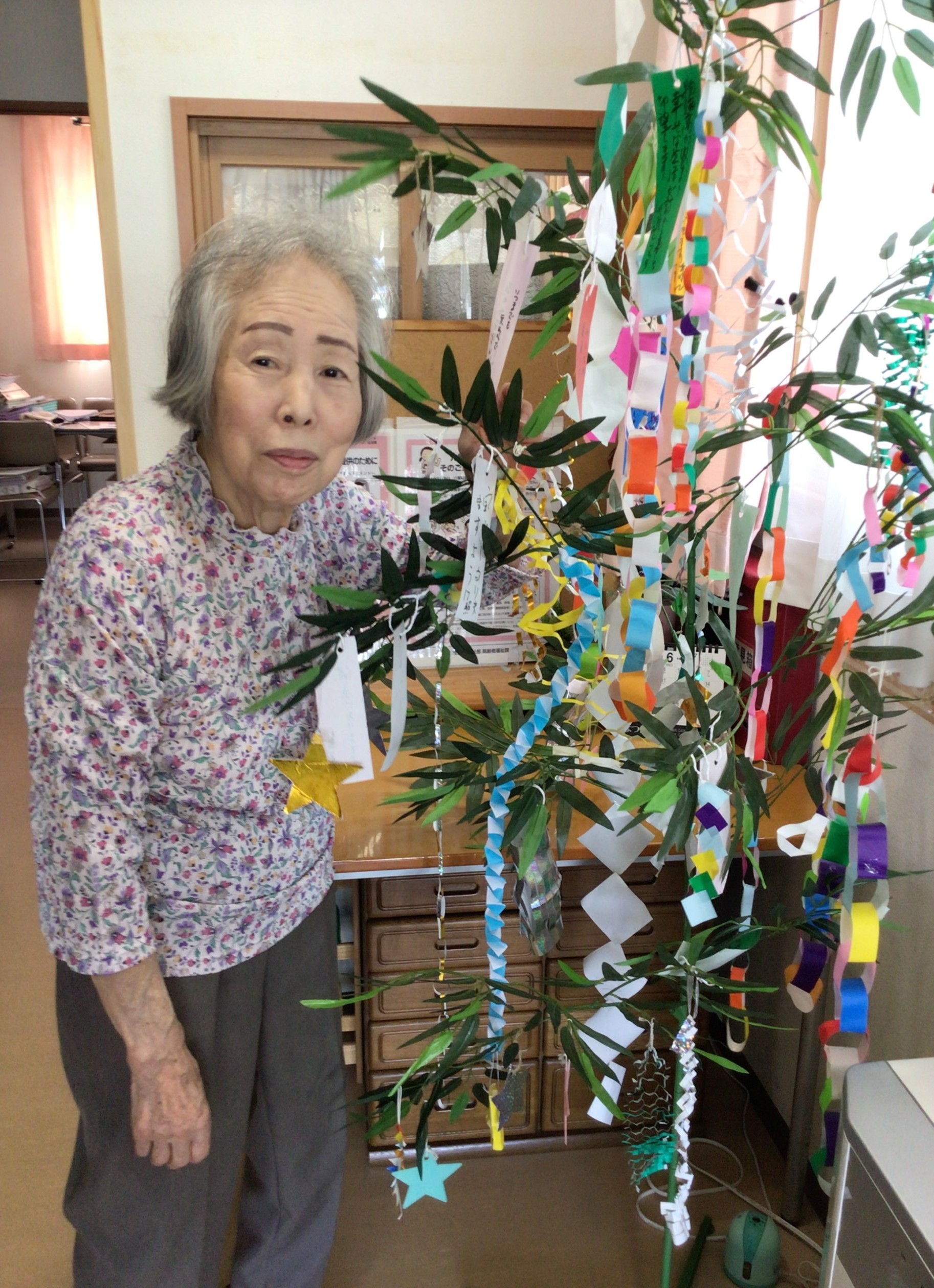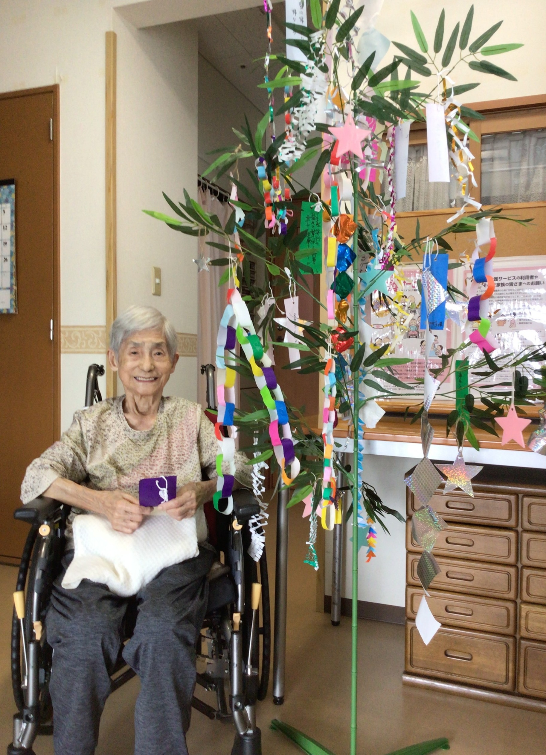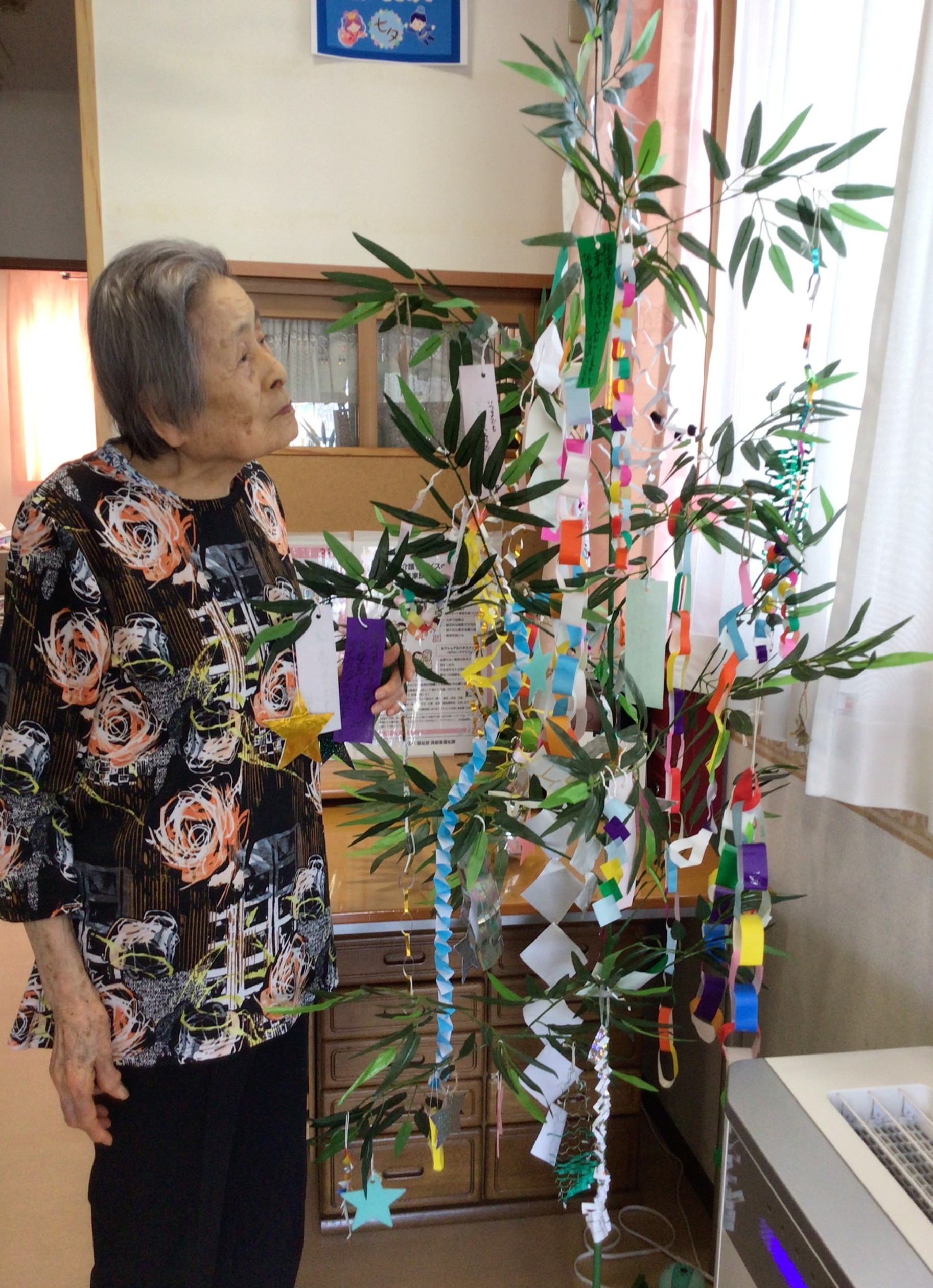 最初は、少し物足りないかな~と思いながら飾り付けをしていたのですが、入居者の皆さんに短冊を書いていただき、たくさんの想いがこめられた、とても素敵な笹になりました。