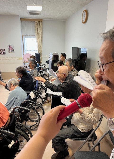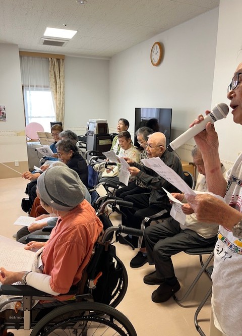 『汽車ポッポ』『青春サイクリング』『みかんの花咲く丘』『明日があるさ替え歌バージョン』、最後には夕焼け小焼けをみんなで合唱しました。