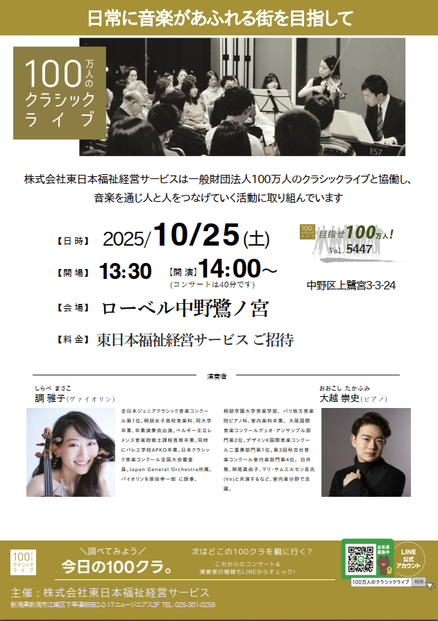来る10月25日(土)14時より『ローベル中野鷺ノ宮』にてクラシックコンサート♬を開催致します。