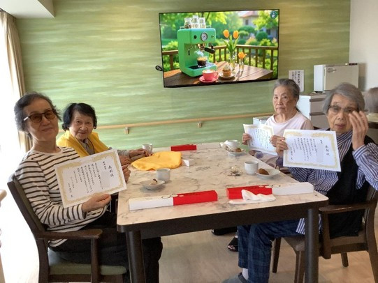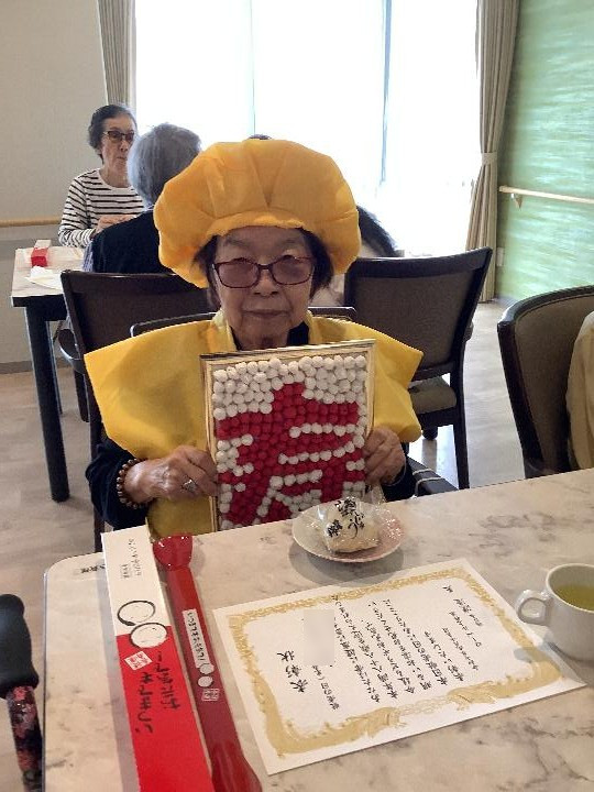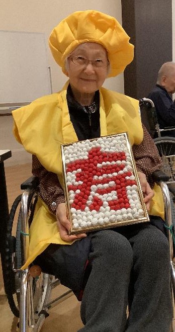 「寿」の文字は、皆さんでお花がみを丸めて文字の形に作りました!記念になりますね。