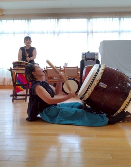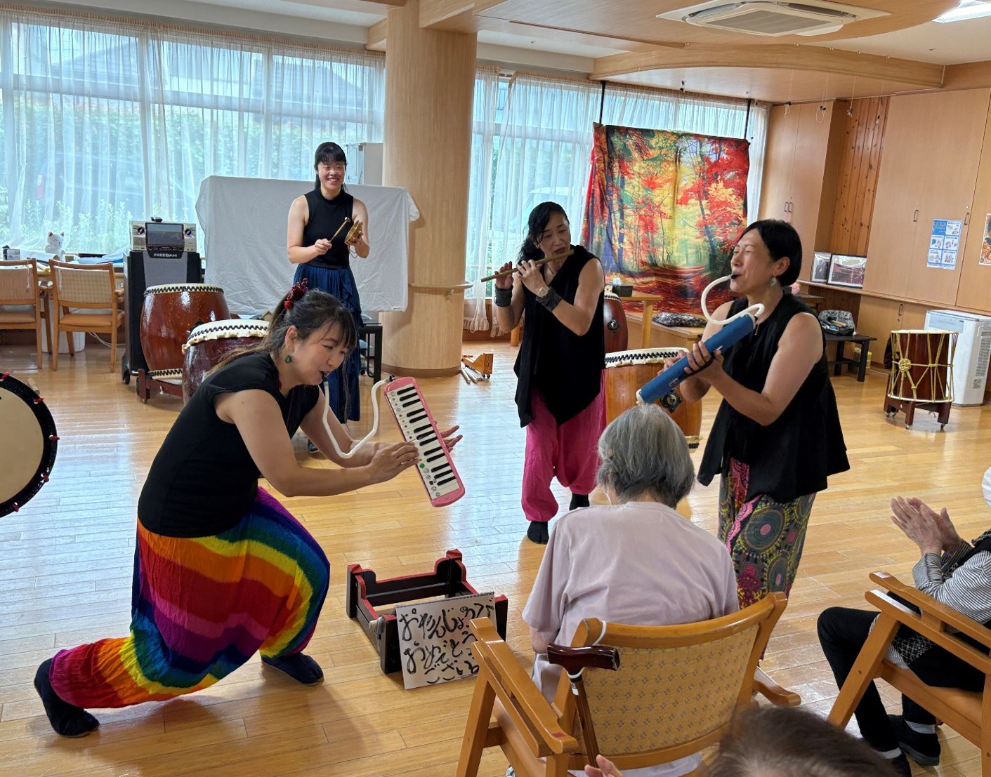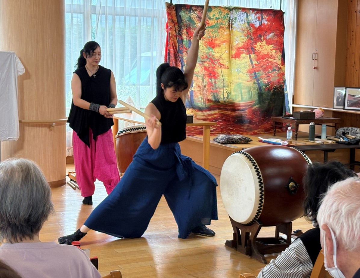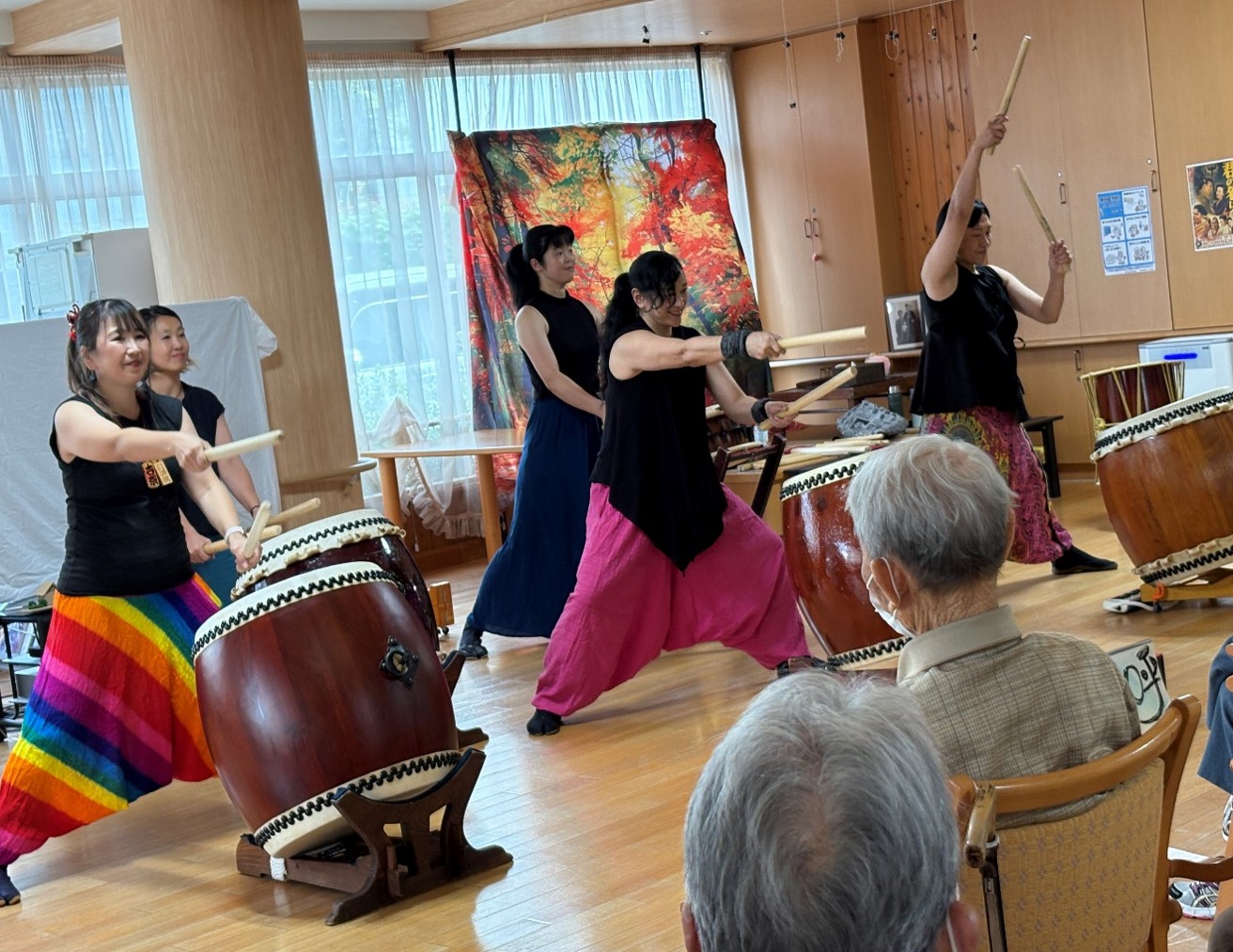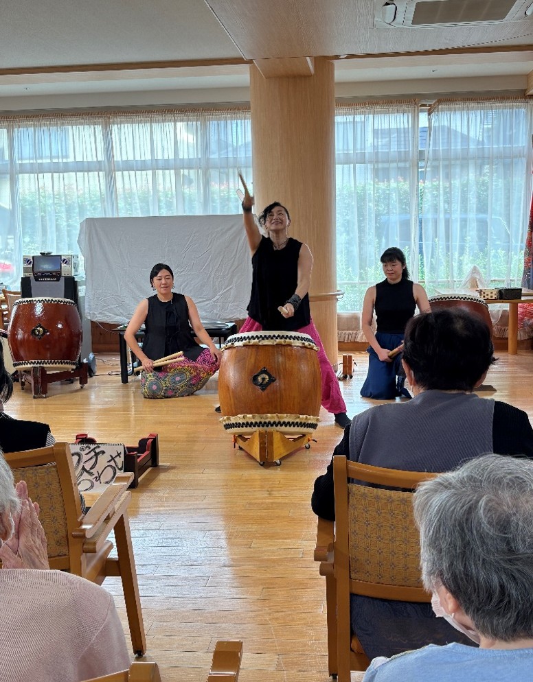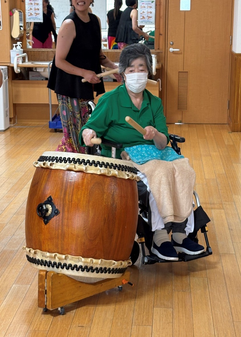 体験コーナーでは、初めて太鼓を叩くことに不安と戸惑いがあったご利用者様でしたが、メンバーの方の楽しい様子に、段々ノリノリに♪